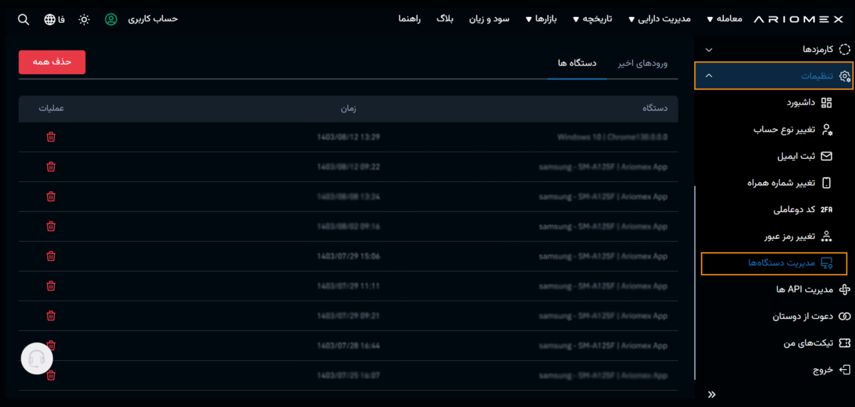 از قسمت منوی کناری گزینه تنظیمات و سپس مدیریت دستگاه ها تب دستگاه ها را انتخاب نمایید.