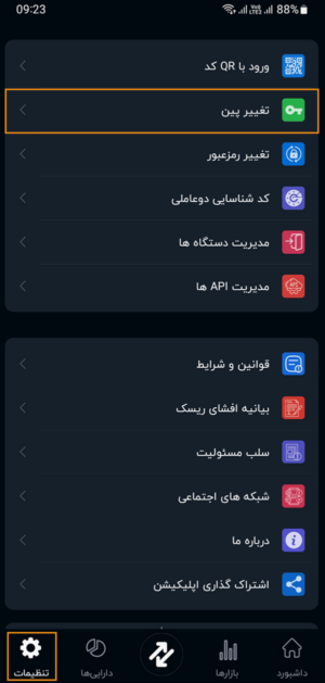 از قسمت تنظیمات گزینه تغییر پین را انتخاب نمایید.