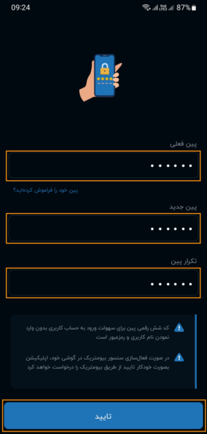 پین فعلی و پین جدید را وارد نمایید و در انتها برای تایید پین جدید تکرار پین را وارد کنید و دکمه تایید را انتخاب نمایید.
