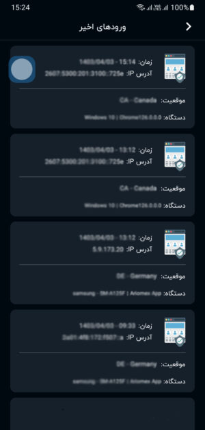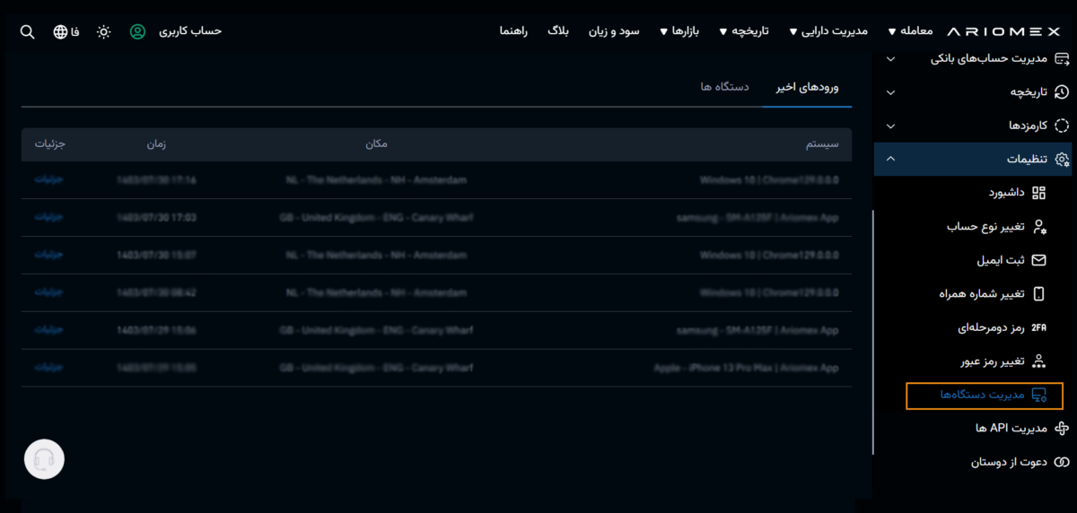 آریومکس به هنگام ورود به حساب کاربری مشخصاتی نظیر IP، دستگاه مورد استفاده و همچنین سیستم عامل دستگاه مورد نظر را ثبت میکند. این مشخصات در حساب کاربری و فقط به خود کاربر نمایش داده میشوند. این فرایند امکانی را ایجاد میکند که کاربران با بررسی این مشخصات کنترل بهتری بر روی ورودهای غیرمجاز یا ناخواسته داشته باشند.