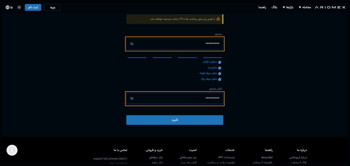 رمزعبور فعلی و رمز عبور جدید را وارد نمایید در انتهای صفحه برای تایید رمز عبور جدید، یکبار دیگر رمز عبور جدید را در قسمت تکرار رمز عبور وارد کنید و دکمه ادامه را انتخاب نمایید.