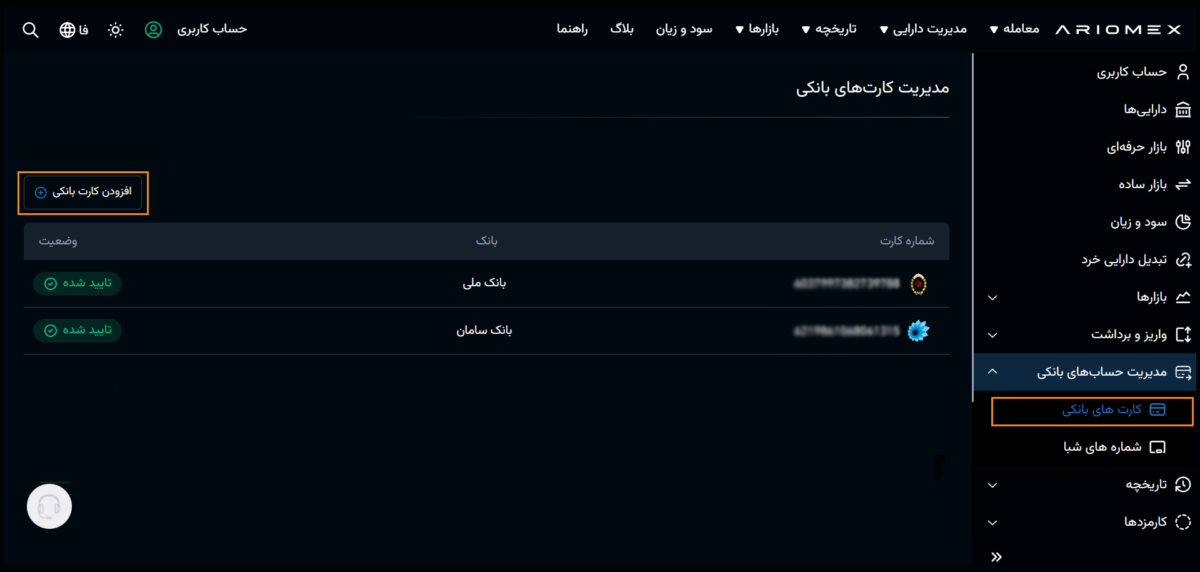 کاربران آریومکس جهت انجام واریز و برداشت تومان نیازمند ثبت و تایید دو حساب بانکی میباشند. توجه داشته باشید که حسابهای بانکی افزوده شده به نام صاحب حساب کاربری و منطبق با کد ملی ثبت شده در احراز هویت باشد. برای واریز به حساب کاربری نیازمند شماره کارت و جهت برداشت نیازمند شماره شبا خواهید بود. جهت افزودن حساب بانکی در حساب کاربری خود: