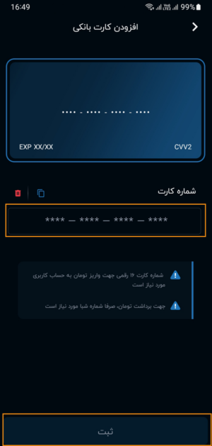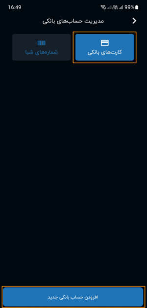 گزینه کارت بانکی یا شماره شبا را انتخاب نموده و سپس دکمه افزودن حساب بانکی جدید را انتخاب نمایید.