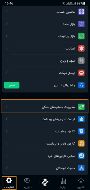 از قسمت تنظیمات، مدیریت حسابهای بانکی را انتخاب نمایید.