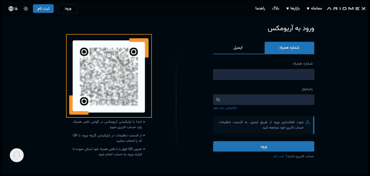 در نسخه دسکتاپ با انتخاب گزینه ورود به صفحه ورود به آریومکس وارد خواهید شد و در نسخه موبایل از قسمت تنظیمات گزینه ورود با QR کد را انتخاب نمایید.