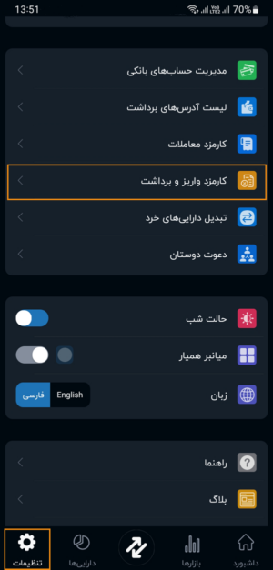 جهت مشاهده وضعیت و مقدار کارمزد واریز و برداشت از قسمت تنظیمات گزینه کارمزد واریز و برداشت را انتخاب نمایید.