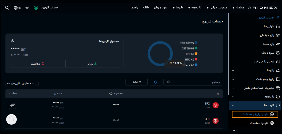 از صفحه حساب کاربری منوی کناری گزینه کارمزدها و سپس کارمزد واریز و برداشت را انتخاب نمایید.