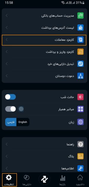 از قسمت تنظیمات گزینه کارمزد معاملات را انتخاب نمایید.