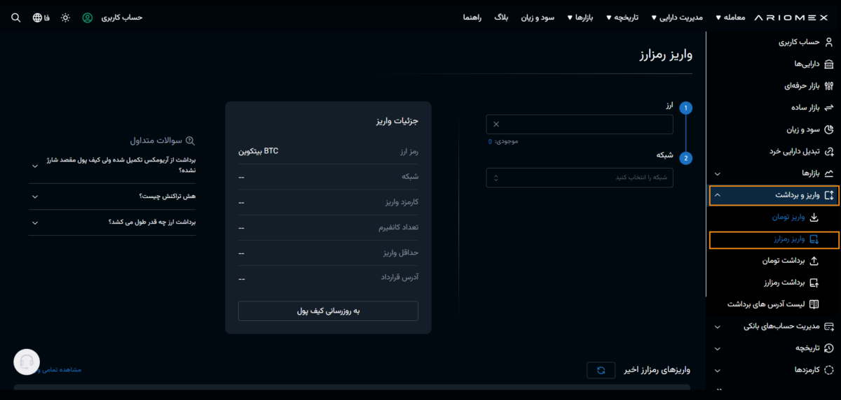 از منو کناری گزینه واریز و برداشت و سپس واریز رمزارز را انتخاب نمایید.