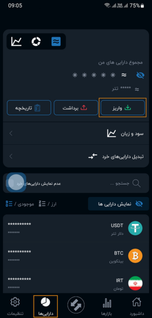 از قسمت دارایی ها گزینه واریز را انتخاب نمایید.