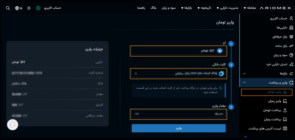 در صفحه حساب کاربری از قسمت منو کناری گزینه واریز و برداشت و سپس گزینه واریز تومان را انتخاب نمایید.