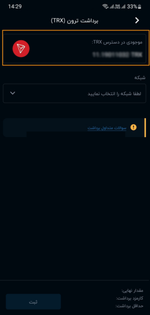 در صفحه برداشت رمزارز مورد نظر، پس از انتخاب شبکه، آدرس و مقدار مورد نظر را وارد و سپس دکمه ثبت را انتخاب نمایید