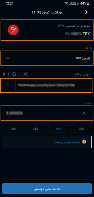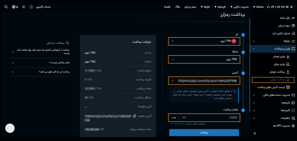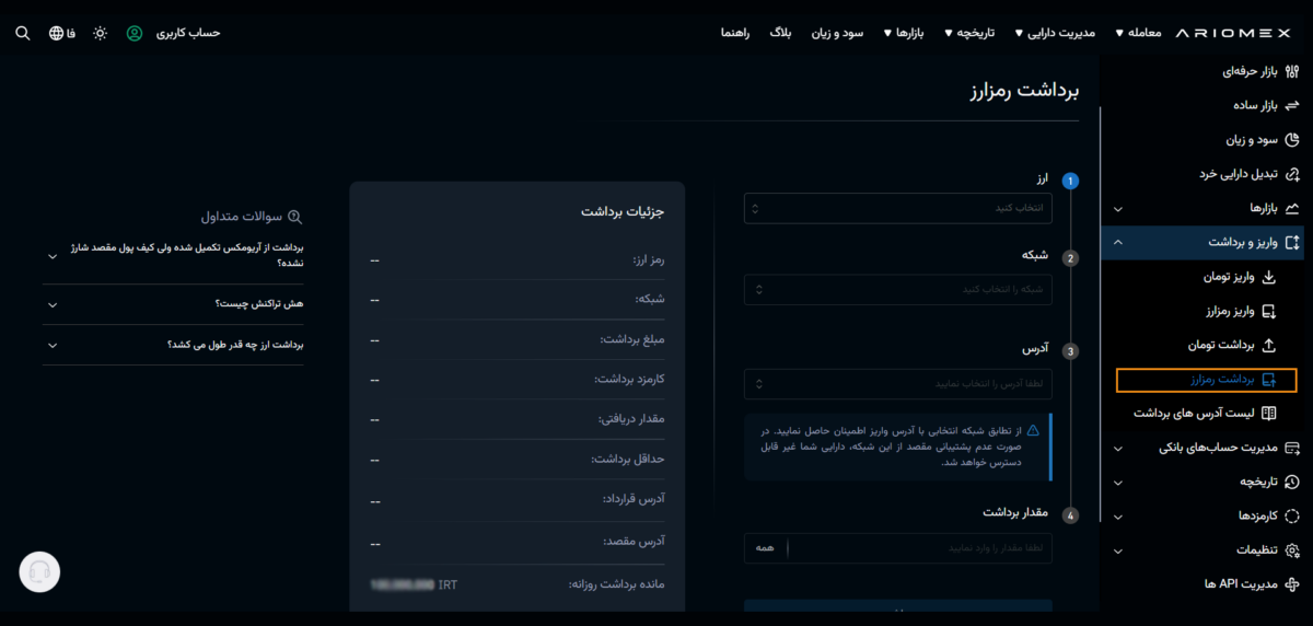 در صفحه ایجاد شده پس از انتخاب ارز مورد نظر، شبکه، آدرس و مقدار مورد نظر را وارد نمایید پس از آن اطلاعات برداشت را بررسی و تایید نمایید.