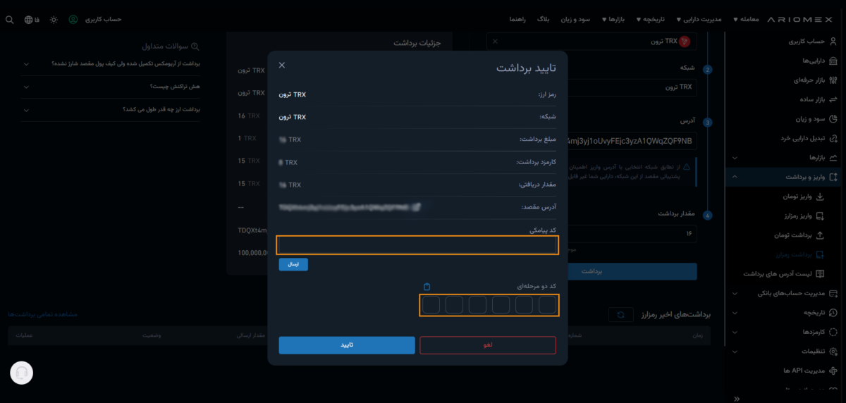 نکته: جهت برداشت رمزارز در آریومکس، آدرس مورد نظر را قبل از برداشت ثبت کنید. این به این معنی است که در حین برداشت، صرفا به آدرسهایی که ثبت و تایید نمودهاید امکان برداشت داده خواهد شد. این فرایند جهت افزایش امنیت برداشتها ایجاد شده و در صورت ورودهای غیرمجاز، امکان برداشت محدود به تایید پیامکی خواهد بود.