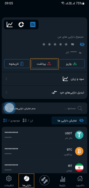 از قسمت دارایی ها روی دکمه برداشت کلیک نمایید.
