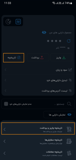از منوی ایجاد شده تاریخچه واریز و برداشت را انتخاب نمایید.