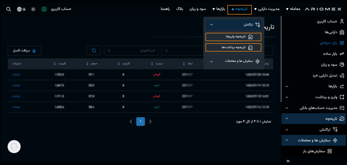 از قسمت منوی بالای صفحه گزینه تاریخچه و سپس زیر منوی تراکنش جهت دسترسی به هر یک از تاریخچه واریز و برداشت به تفکیک قابل دسترسی می باشد.