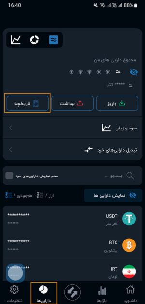 از قسمت دارایی ها گزینه تاریخچه را انتخاب نمایید.