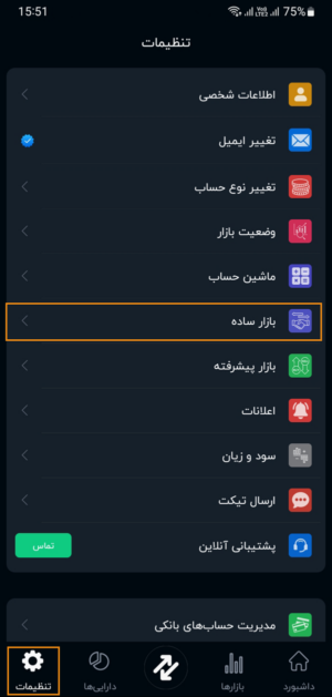 پس از ورود به حساب کاربری از قسمت تنظیمات روی گزینه بازار ساده، کلیک نمایید.