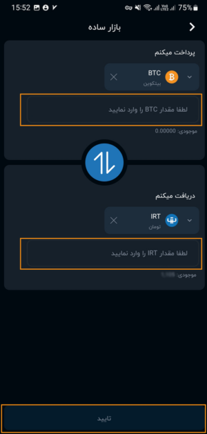 ابتدا رمزارزی که پرداخت میکنید را در قسمت پرداخت میکنم انتخاب کنید و سپس مقدار مورد نظر را وارد نمایید.