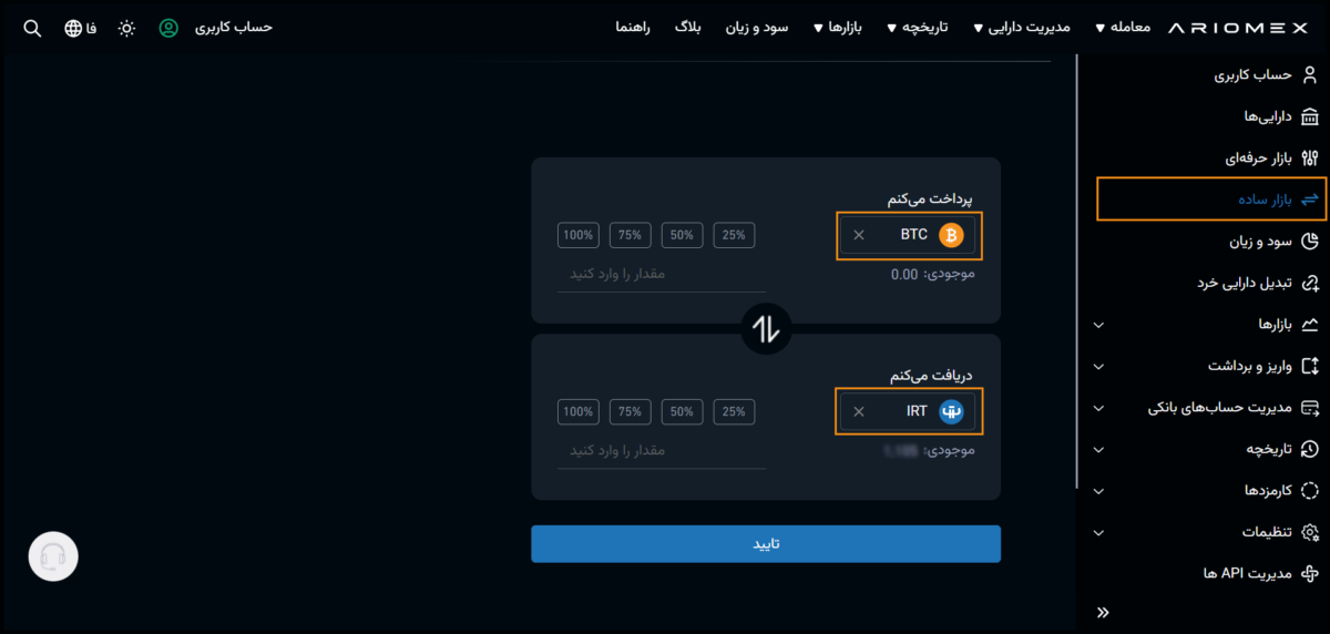 همینطور میتوان پس از ورود به حساب کاربری از منوی کناری صفحه گزینه بازار ساده را انتخاب نمایید.